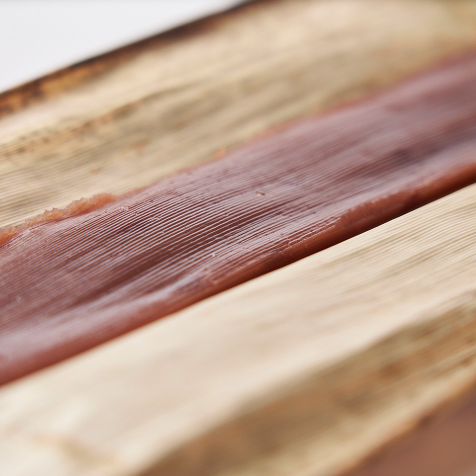 北海道十勝産小豆のあんに徳島県産の和三盆糖を加え、竹皮に包んで蒸し上げました。竹皮の香りがほんのりと立つ奥ゆかしく上品な甘さの蒸し羊羹です。